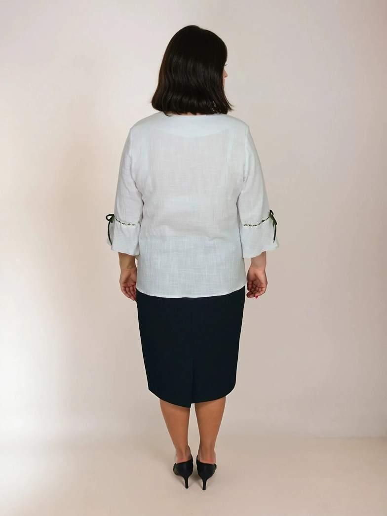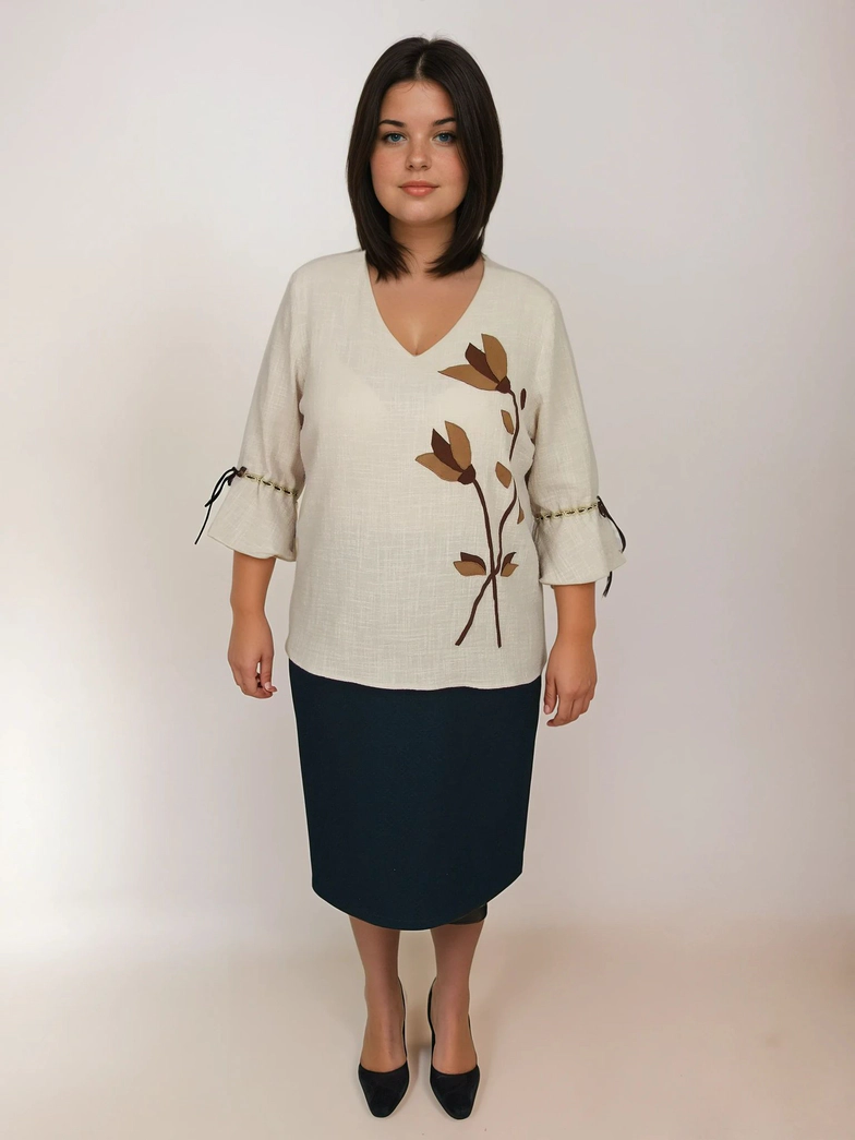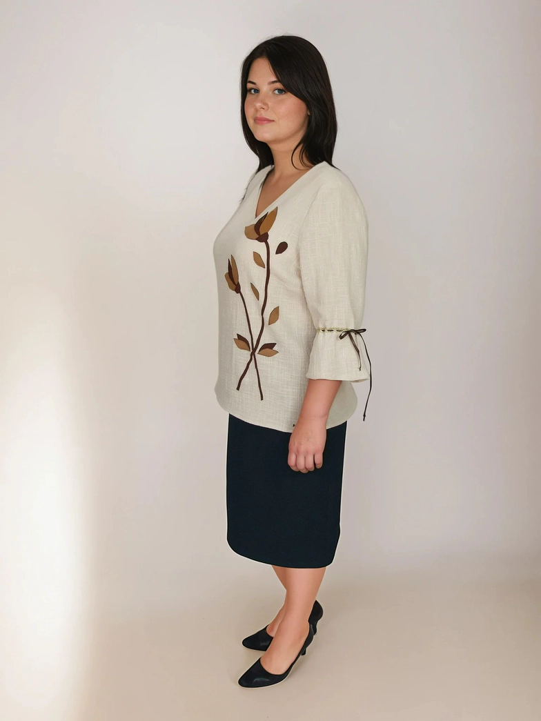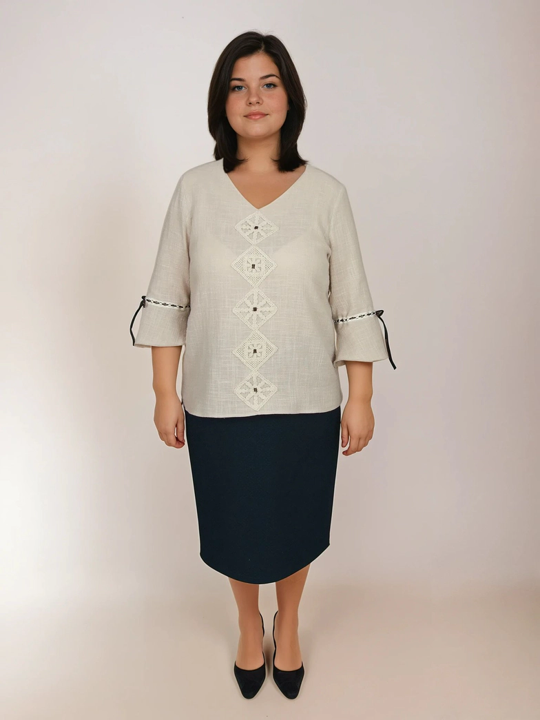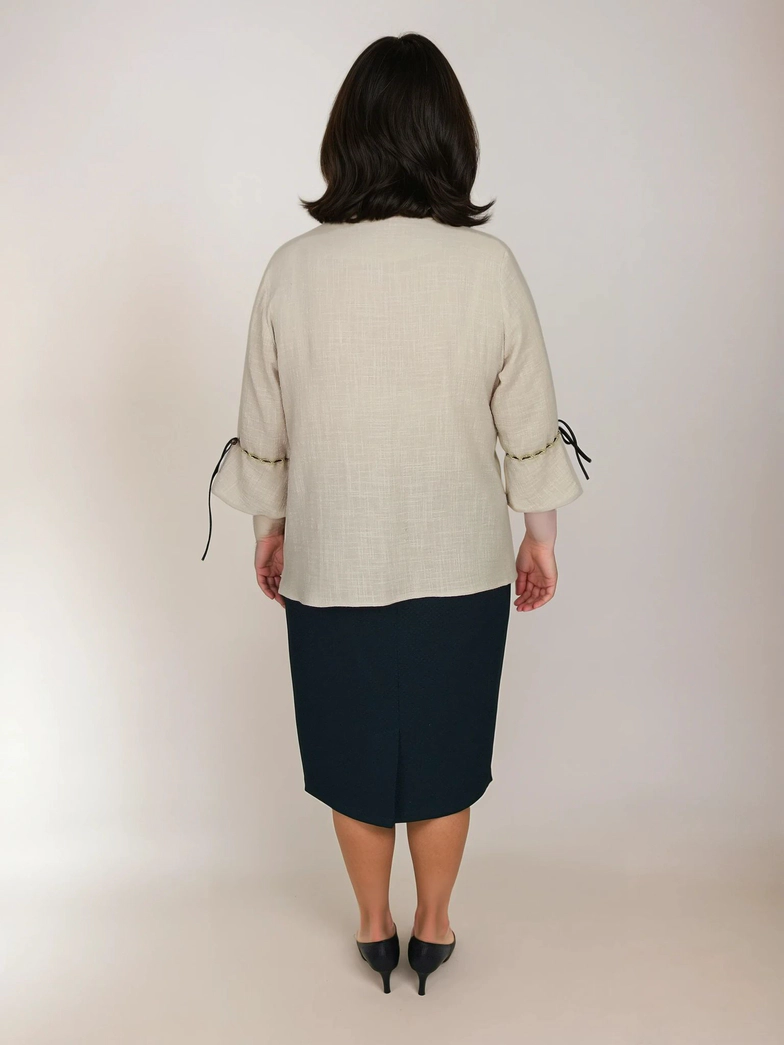 Bluză din imitație de in, cu croială lejeră și mâneci clopot cu detalii decorative. Modelul prezintă diferite elemente decorative pe partea din față și șnururi la mâneci. Se potrivește ideal cu fuste lungi sau pantaloni clasici.