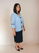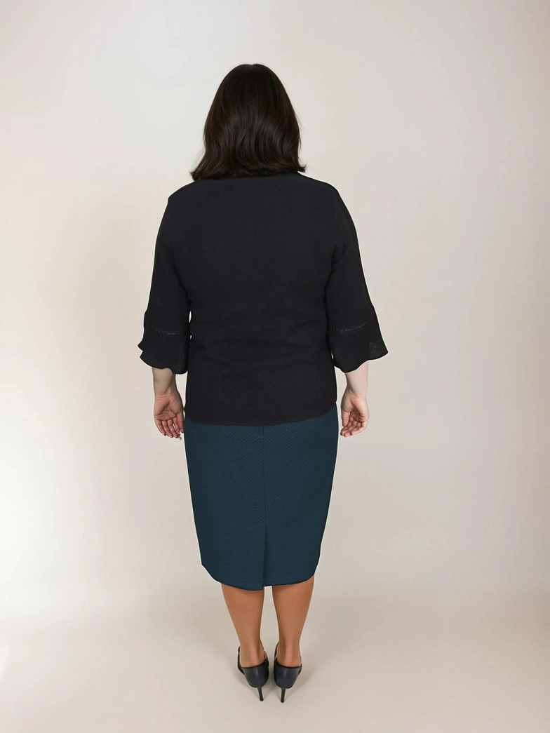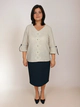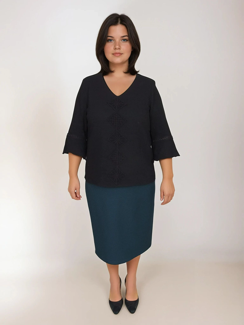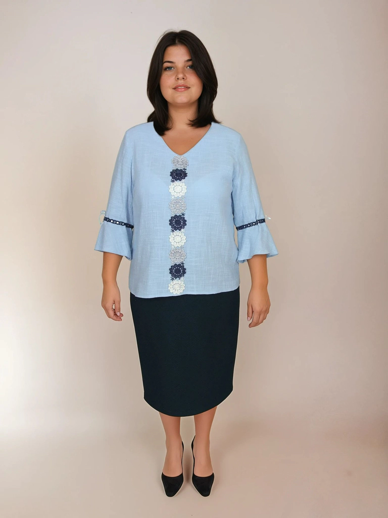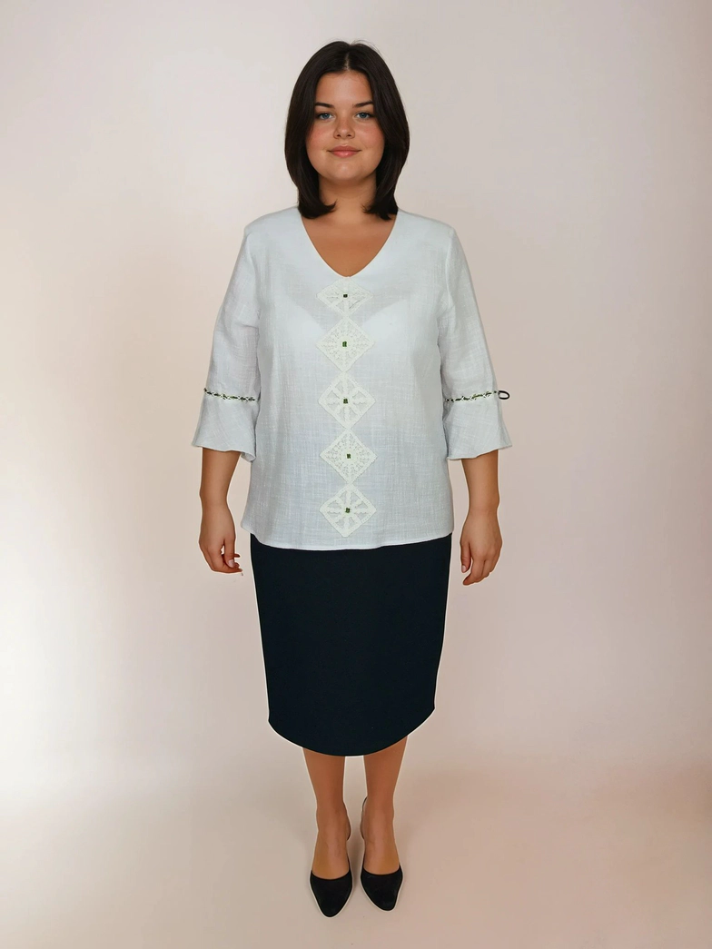 Bluză din imitație de in, cu croială lejeră și mâneci clopot cu detalii decorative. Modelul prezintă diferite elemente decorative pe partea din față și șnururi la mâneci. Se potrivește ideal cu fuste lungi sau pantaloni clasici.