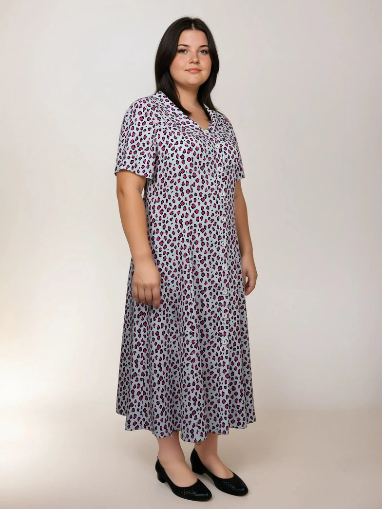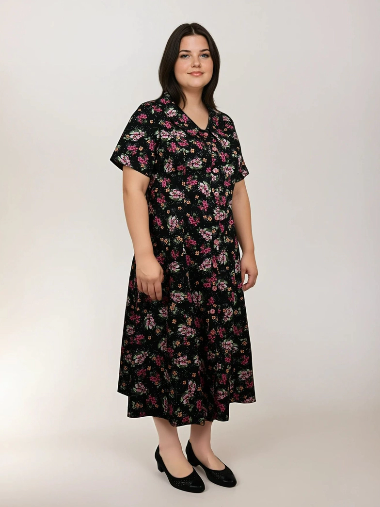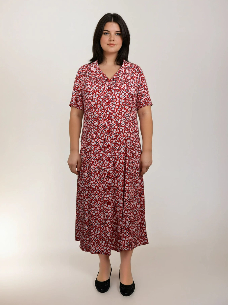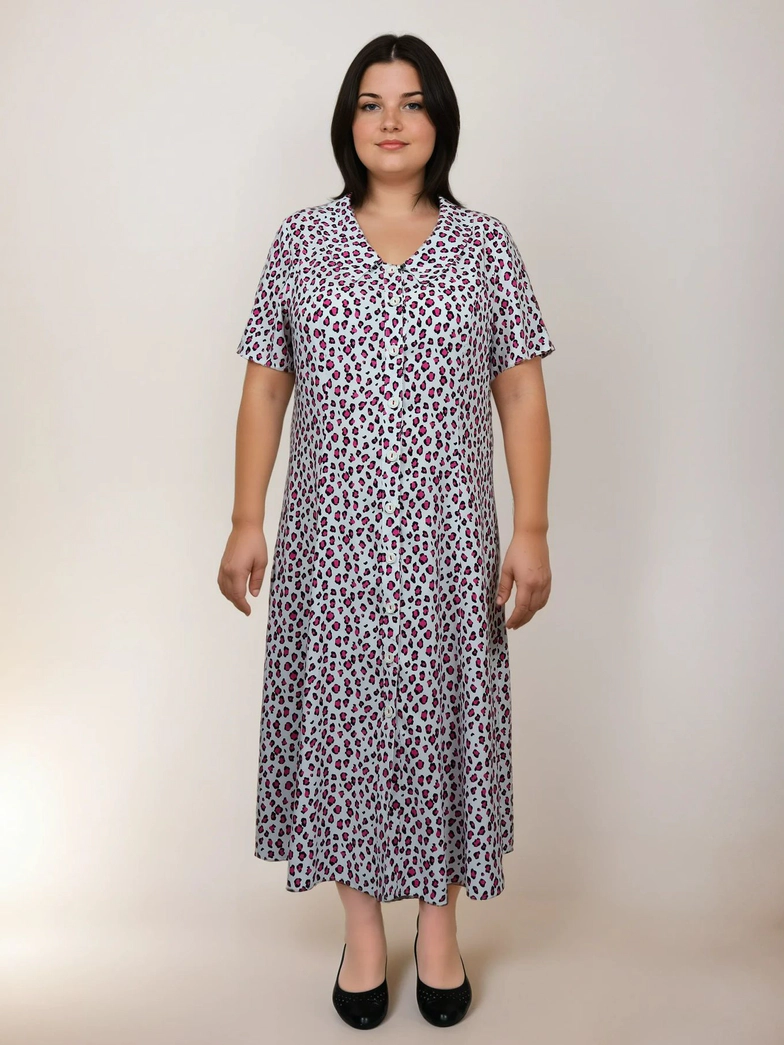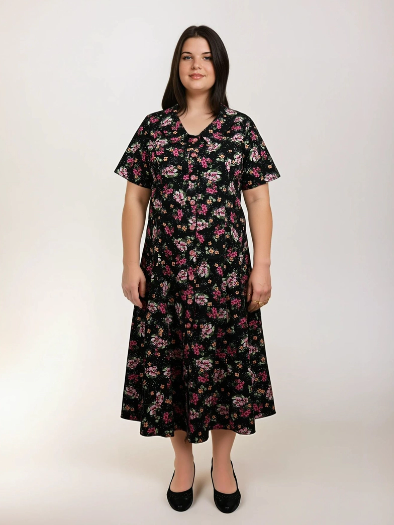Rochie vâscoză, încheiată cu nasturi și mânecă scurtă. Toate modelele prezintă imprimeuri florale în nuanțe variate. Ideală pentru sezonul cald.